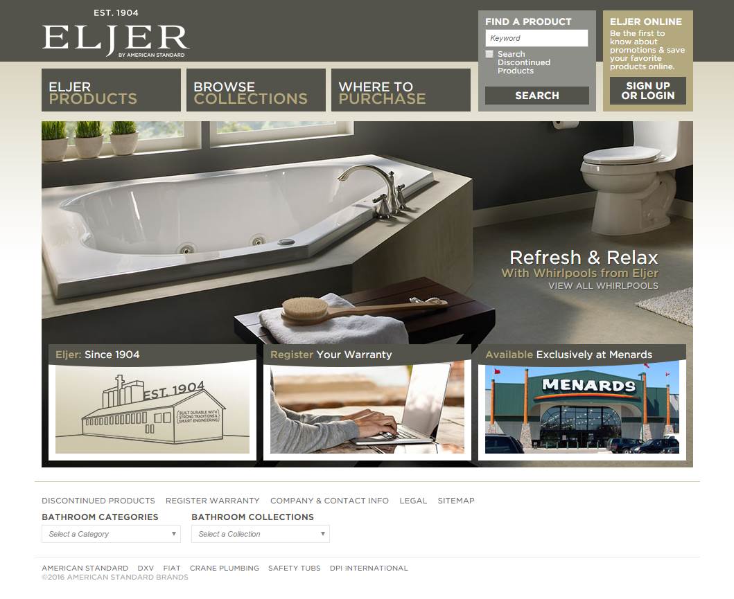 Design and development of Eljer website, an American Standard brand sold exclusively at Menards. Features profile system integrated across all American Standard sites.